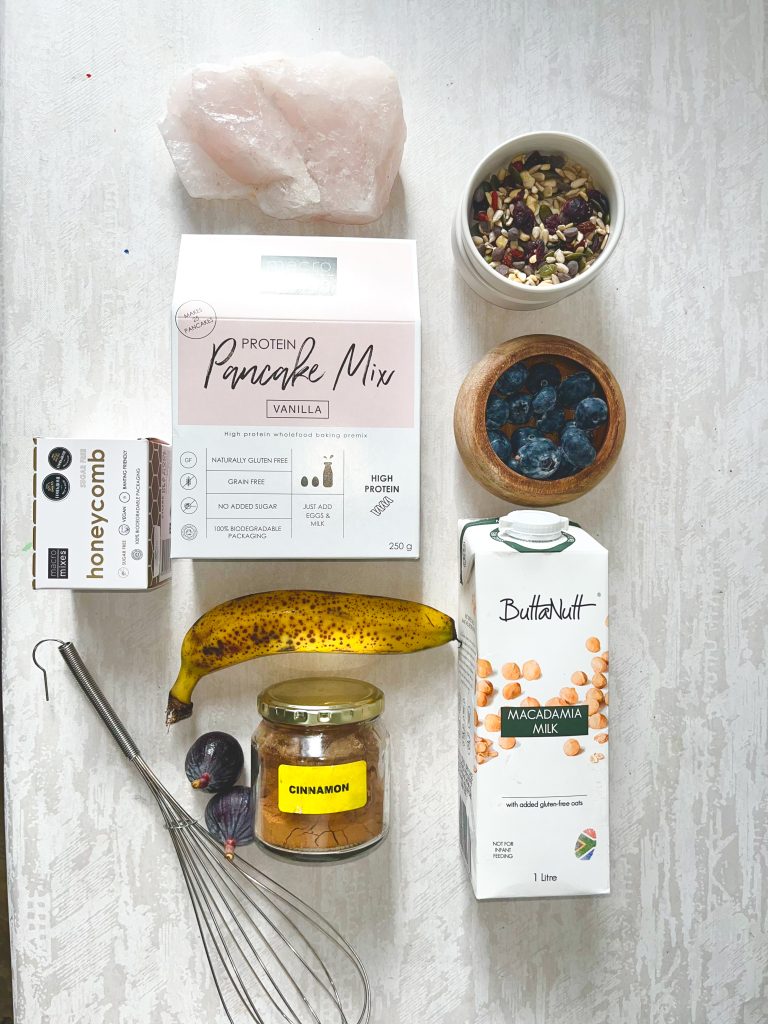 - Add 50g of Protein Pancake Premix and whisk again. Add blueberries and fold in the mixture