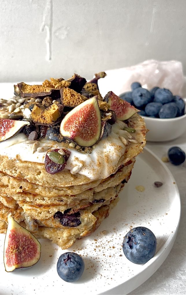 - For toppings, add Coconut cultured cream, honey combs, chopped fig, blueberries, drizzle honey and finish off with the seeds and nuts.