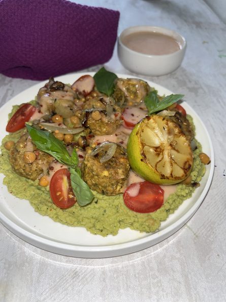 This meal is gluten free, has no sugar and plant based. The Avo basil hummus and falafels complement each other so well accompanied by a creamy coconut cream peri peri sauce and caramelised onion. Tastes so fresh, delicious and healthy!